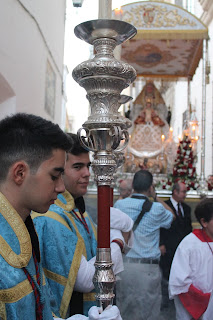- Pertigueros: los acólitos están mandados por los pertigueros. Figura uno delante de cada paso. Portan la pértiga, generalmente de plata, con la que indican las órdenes a los acólitos. Visten ropón de terciopelo con bordados, rematado por gola de encaje y, sobre el pecho llevan un medallón de plata.